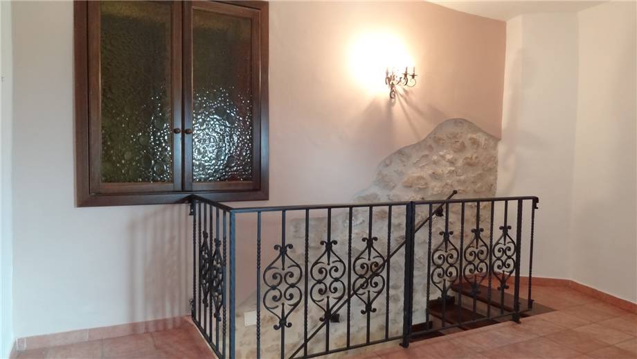 • Piano terra: ingresso diretto nella cucina (di forma semicircolare), accesso con alcuni scalini a un ampio soggiorno, parzialmente scavato nella roccia con parete in pietra a vista e inserti in mattone.